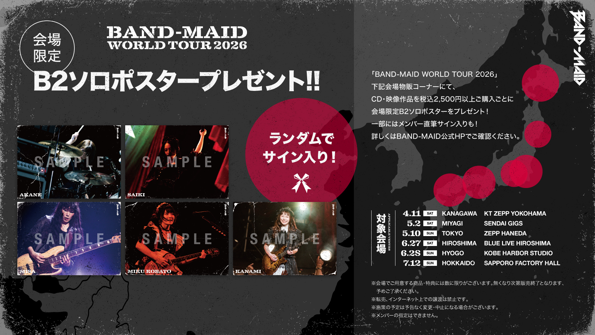 「BAND-MAID WORLD TOUR 2026」下記会場の物販コーナーにてCD・映像作品をご購入の方へ、会場限定特典をプレゼント!